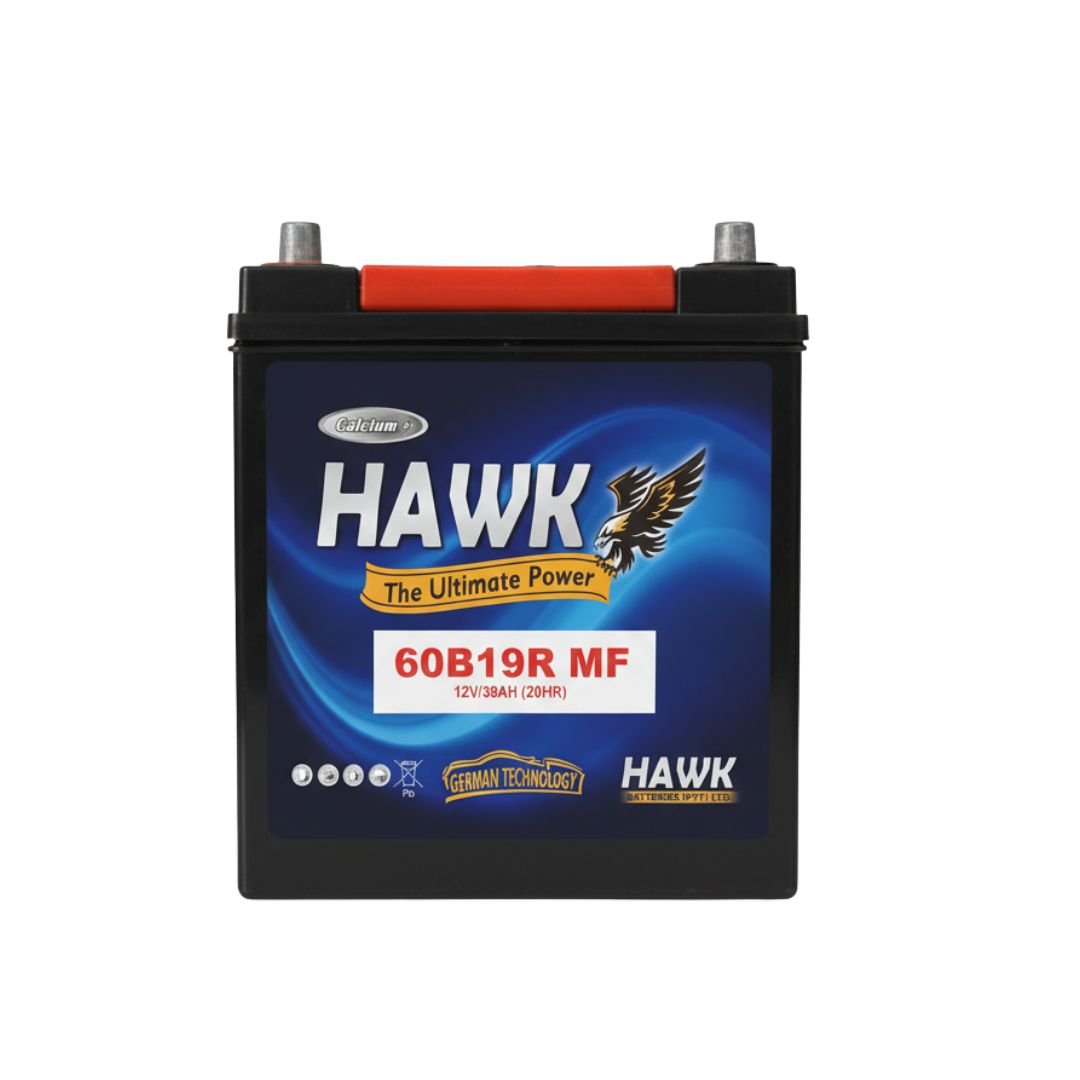 The HAWK 60B19R MF offers reliable starting performance and long life. Suitable for various vehicles requiring 38Ah capacity.